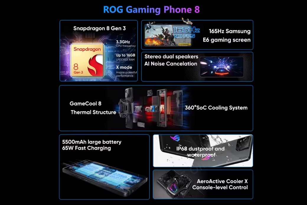 หัวใจหลักของ ROG Phone คือชิปเซ็ตระดับท็อปสุด ณ เวลานั้น (เช่น Snapdragon 8 Gen 3) ซึ่งมาพร้อมกับระบบระบายความร้อนที่ออกแบบมาอย่างดี